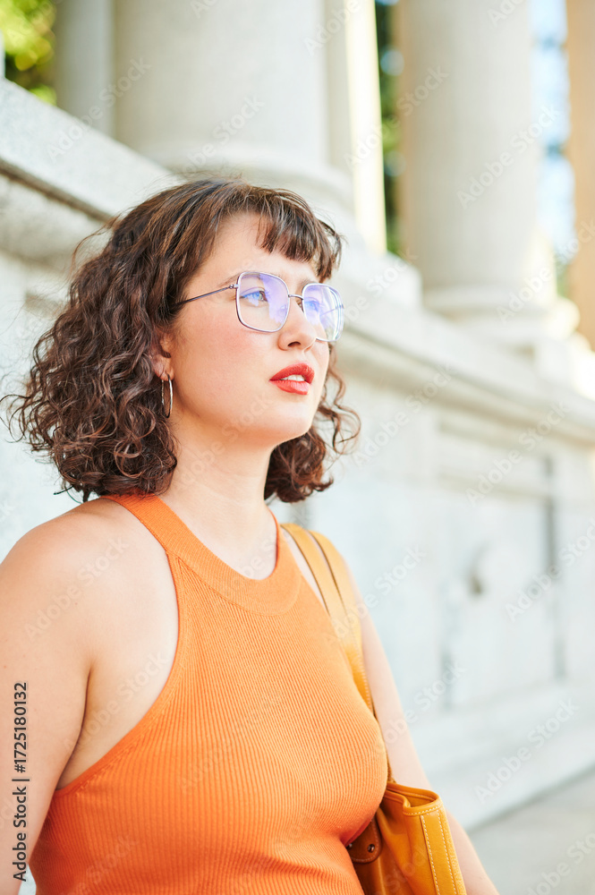 Real beauty of a young tourist woman with wavy hair, glasses, and an orange summer dress relaxing during a tour of a European city. Body acceptance concept.