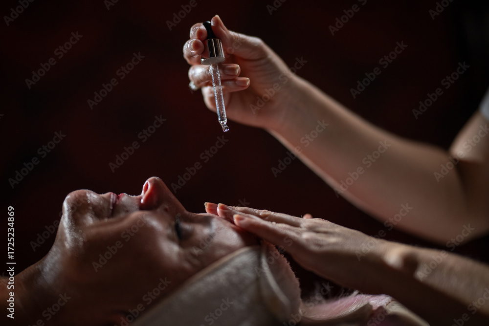 Close up of a mature woman lying in a spa while a therapist applies skincare serum with a dropper above her face. Beauty and wellness concept highlighting anti aging treatment, hydration, and holistic