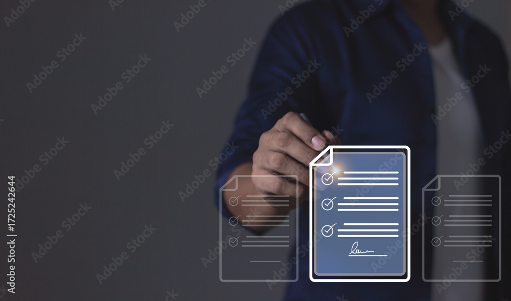 Young man with smartphone mobile hand touching to sign a Online Business Contract, Electronic signature, Contract signing, Digital documents, Future smart contract