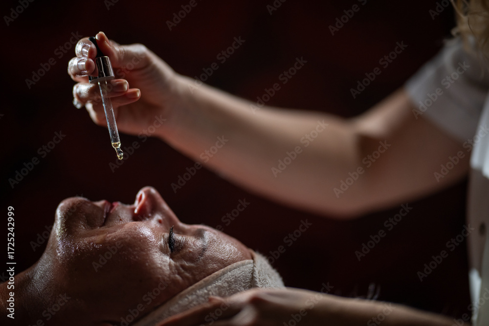 Close up of a mature woman lying in a spa while a therapist applies skincare serum with a dropper above her face. Beauty and wellness concept highlighting anti aging treatment, hydration, and holistic