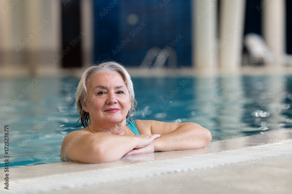 Smiling senior woman enjoying relaxation in an indoor swimming pool, leaning on the poolside. Concept of active lifestyle, wellness, health, hydrotherapy, and leisure for older adults.