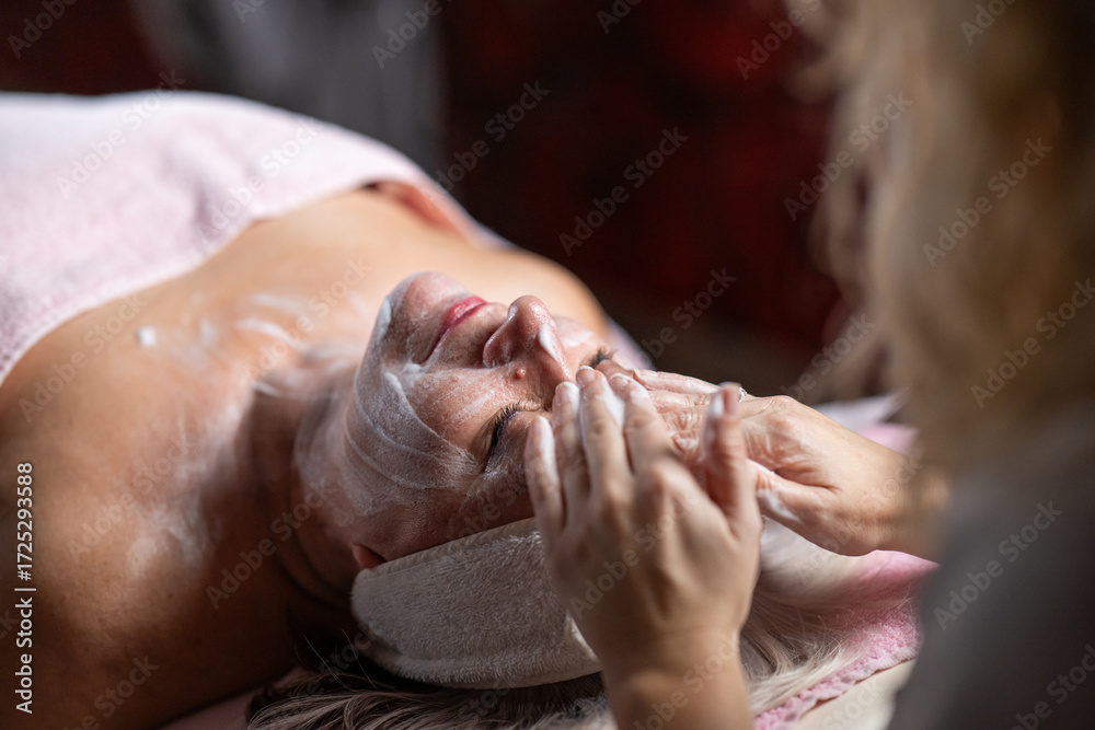 Close up of a mature woman lying on a treatment bed with a towel and headband while a professional therapist applies foam during a facial cleansing procedure. Skincare and wellness concept