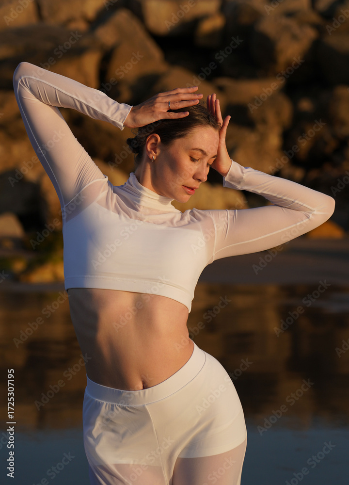 Model in sheer white outfit posing on a beach near rocky background under golden light. Graceful arm gesture. Female dancer in coastal setting.