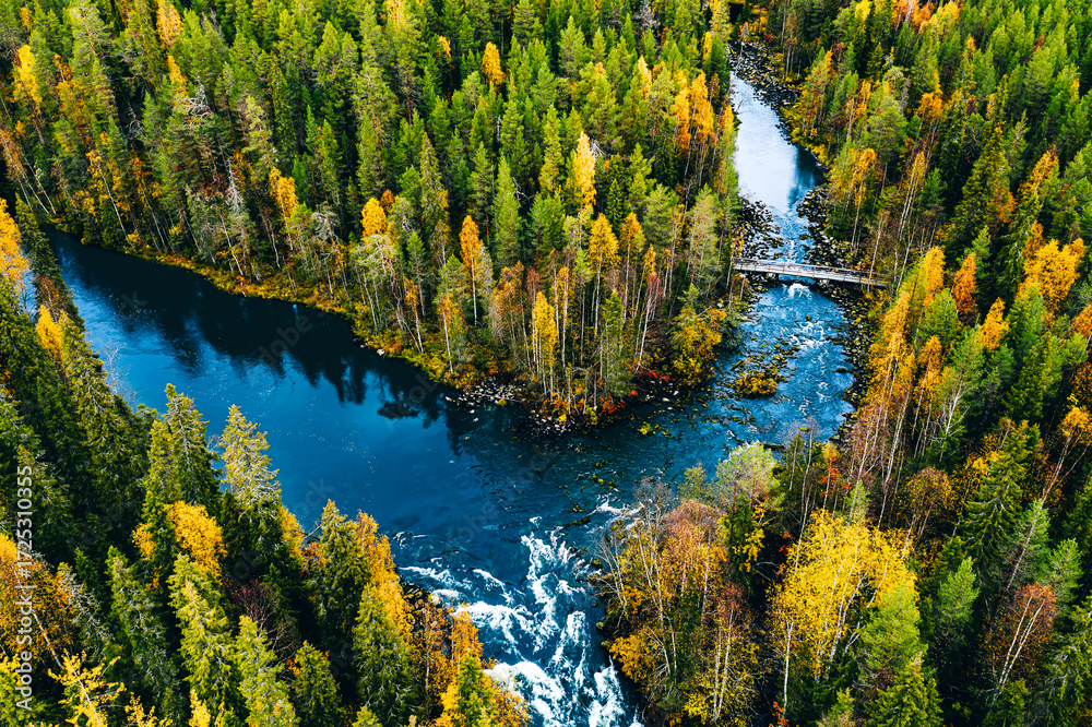 Aerial view of fast river flow through the rocks and colorful forest. Autumn in Finland