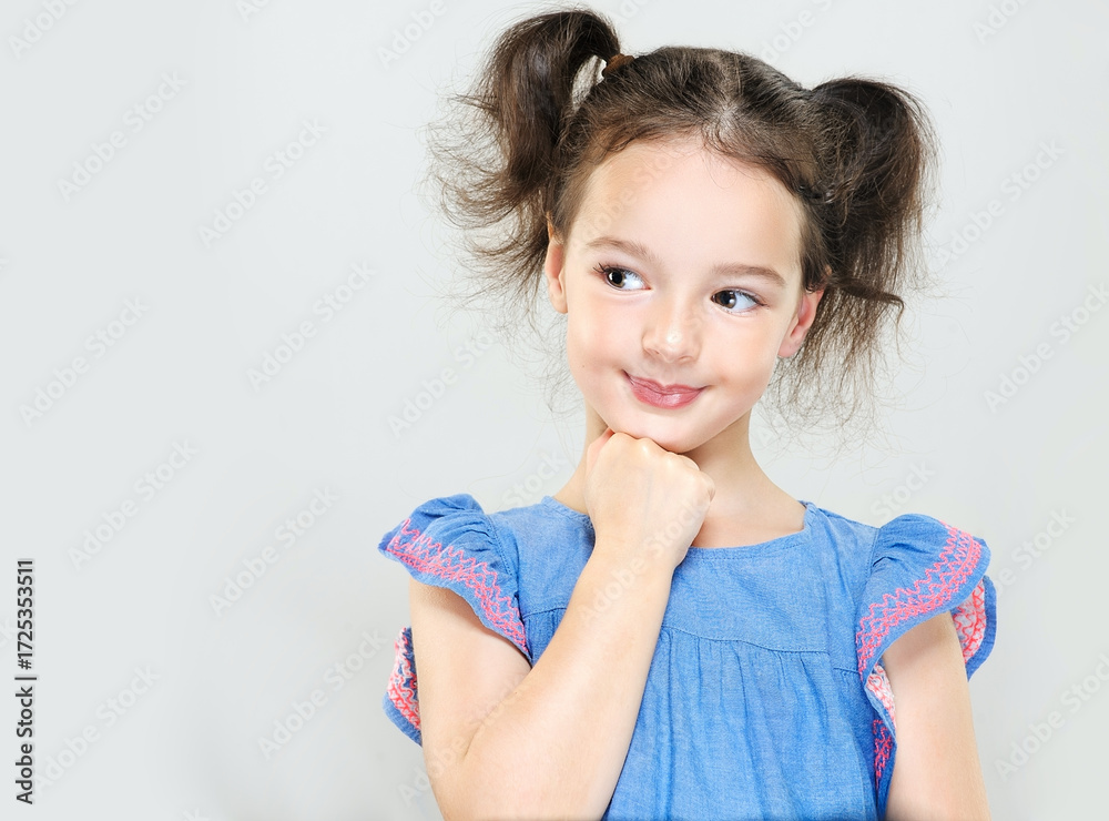 The child is a beautiful girl with wide eyes, look away in surprise. Baby in a knitted sweatshirt . Children's products , clothing and accessories . Expressive facial emotions