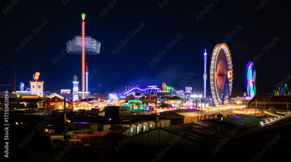 Panorama of the Oktoberfest in Munich at night - world-famous folk festival with colorful lighting, rides and cozy tents in Bavarian metropolis - Germany 2025-09-21