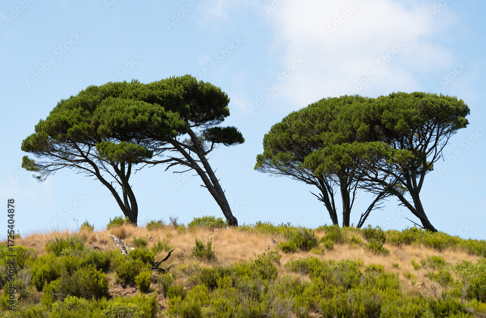Group of umbrella-shaped trees on a dry hill under a blue sky. Contrast between green canopy and golden grass. Mediterranean landscape.