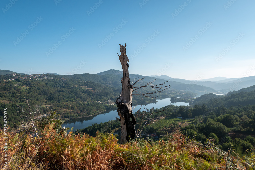 Tronco solitário e queimado contra uma magnífica paisagem montanhosa e verdejante e um rio serpentino sob um céu azul da manhã