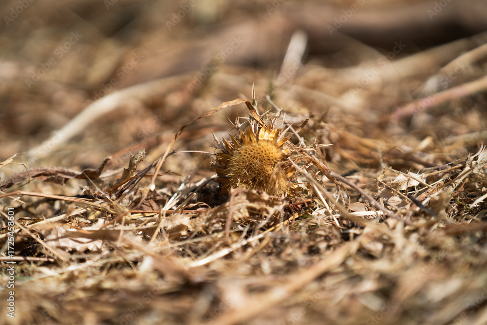 Spiky seed pod among dry grass, twigs, and leaves. Macro texture, seasonal vegetation, plant debris, forest floor detail.