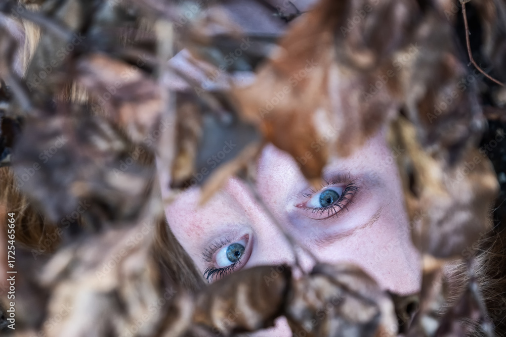 Striking close-up of blue eyes gazing through a frame of dry leaves. The intimate portrait evokes curiosity, mystery, and the quiet presence of nature