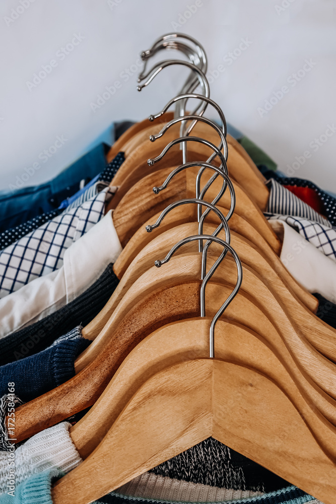 close-up of a stack of wooden hangers