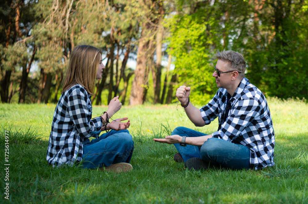 Father And Daughter Sitting On Grass In Summer Park Playing Rock Paper Scissors