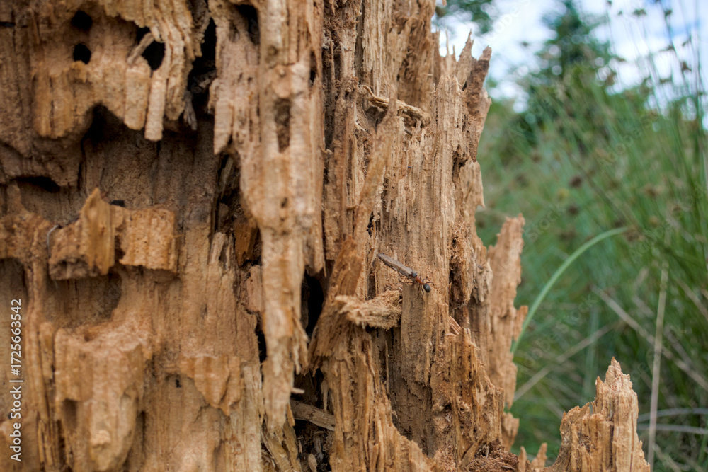 Detailed close-up of decayed wood showing insect damage and hollowed textures in a forest setting—perfect for ecological, texture, and nature studies.