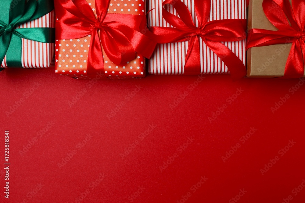 Elegant red wrapped gift boxes with ribbon placed on a red surface. Top view, space for text