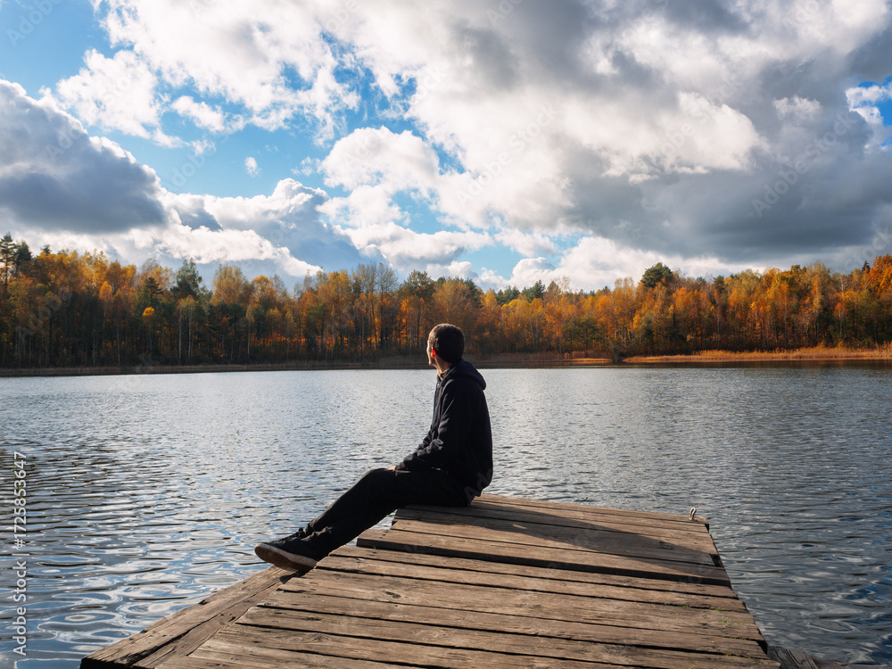 A man sits on a wooden bridge by the lake and admires the autumn landscape.