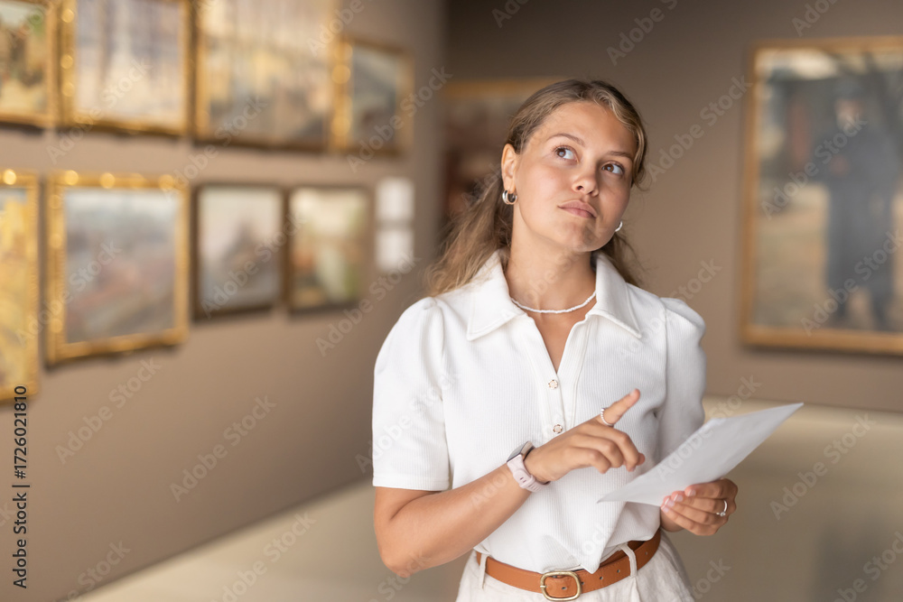 Girl with guidebook walk along exhibition pavilion, get acquainted with pictures. Paintings, icons, photo objects, contemplations of masterpieces of fine art are placed on walls