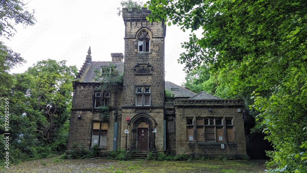 Abandoned Dalton Grange Mansion stately home, Huddersfield, Yorkshire UK. Eerie old 'haunted house' derelict in forest grounds. Creepy boarded up country manor house, gothic church tower ruins