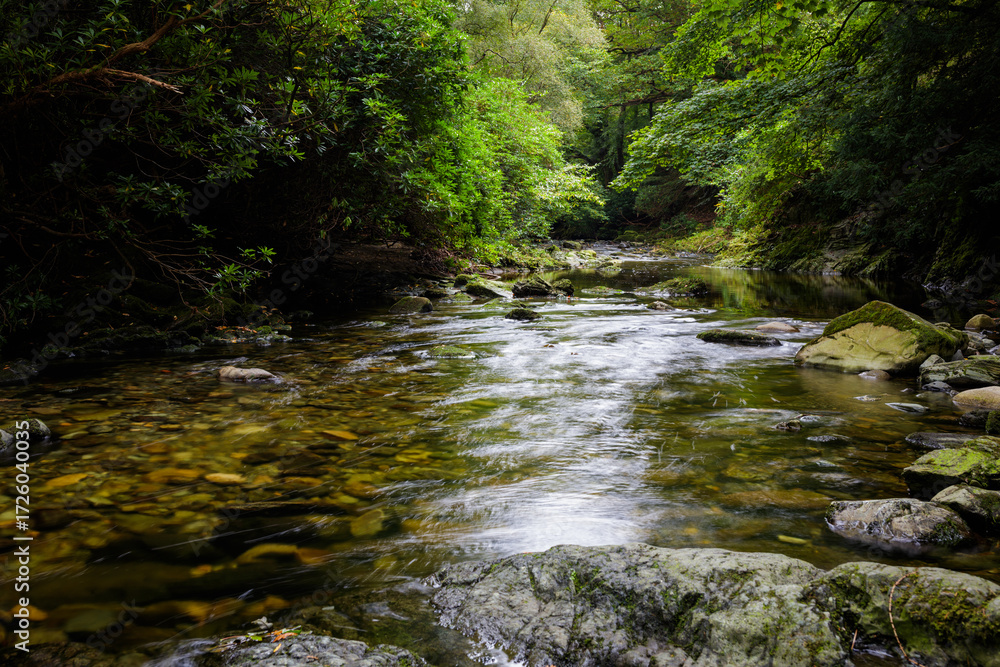 A stream flowing through the forest mountain in Northern Ireland