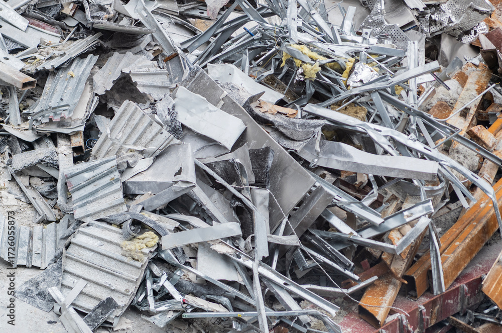 Aluminum industry extrusion at building construction site. Aluminum building system. Aluminum extrusion profile. Construction site storage with aluminum tubes. Steel extrusion. Industry material