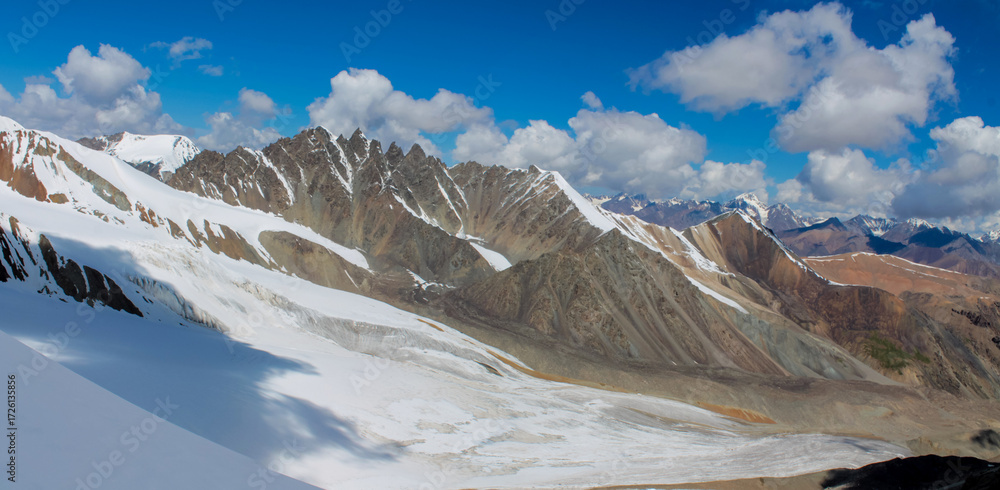 Tian Shan mountains snow peaks high resolution wide angle panoramic landscape. Huge glacier and snow summits in Pamir mountains at Ibn Sina (Avicenna) Peak, Lenin Peak on border of Kyrgyzstan