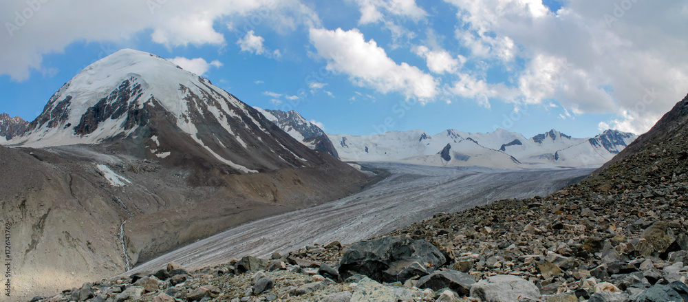 Tian Shan mountains snow peaks high resolution wide angle panoramic landscape. Huge glacier and snow summits in Pamir mountains at Ibn Sina (Avicenna) Peak, Lenin Peak on border of Kyrgyzstan