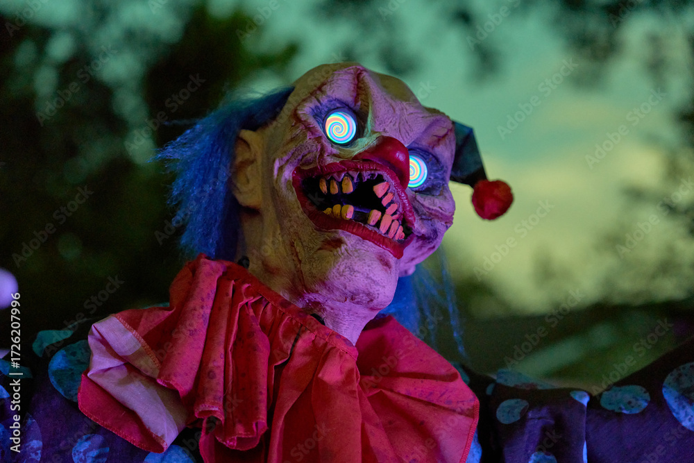 A sinister clown stares with bright spiral eyes and a red nose under night light. Blue hair, rough wrinkles, and big ruffles make a spooky Halloween display.