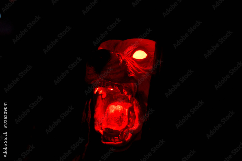 A snarling monster dog head glows bright red in the dark. Fangs, open mouth, and fiery eyes create a scary Halloween display.