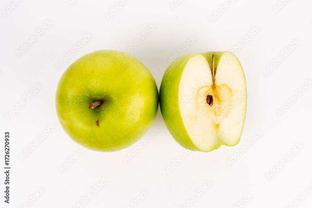 Overhead view captures whole green apple beside its sliced half on a clean white background.