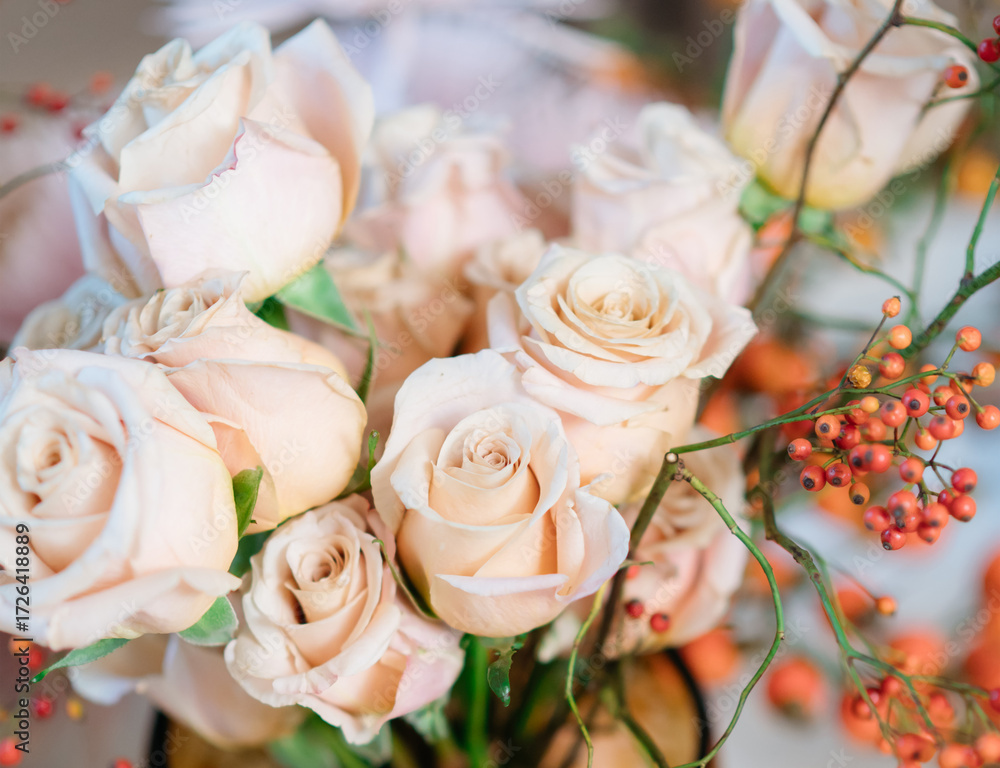 Soft Pink Roses with Orange Berries in Floral Arrangement