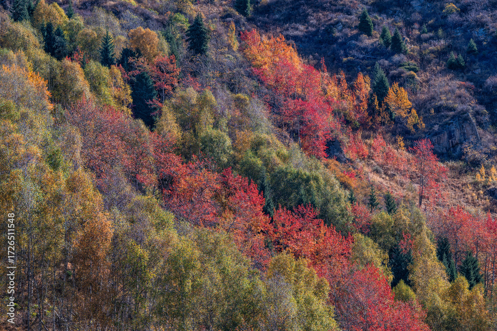 Picturesque multi-colored mixed forests of the Trans-Ili Alatau Mountains in the vicinity of the Kazakh city of Almaty