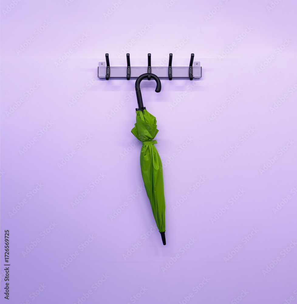 Colorful umbrellas hanging on hook against color wall, idea foe lifestyle, social media fashion post or marketing materials concept.