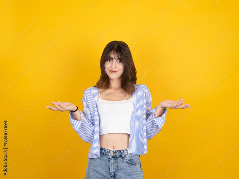 Woman spreading hands aside, portrait of young caucasian 20s trendy cute woman spreading hands aside smiling looking camera isolated on yellow studio background. Wear white top and shirt. Copy space.