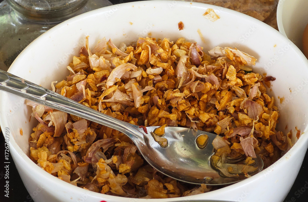 Close-up of crispy golden brown fried garlic served in a white bowl with a metal spoon. A popular aromatic topping in Thai and Asian cuisine