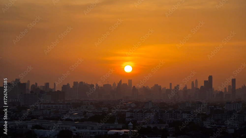 A stunning sunset view over a bustling metropolitan skyline. The golden-orange hues of the sky bathe the city buildings in warm light
