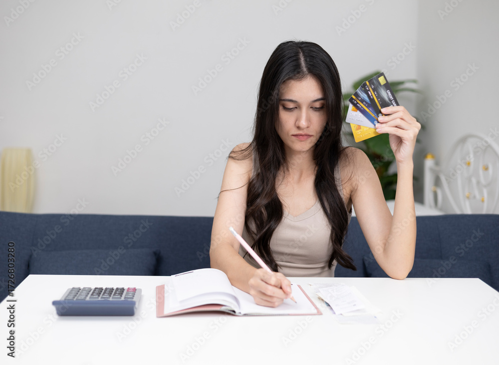 A woman is calculating income and expenses from using a credit card, writing them down in a notebook and using a calculator to calculate.