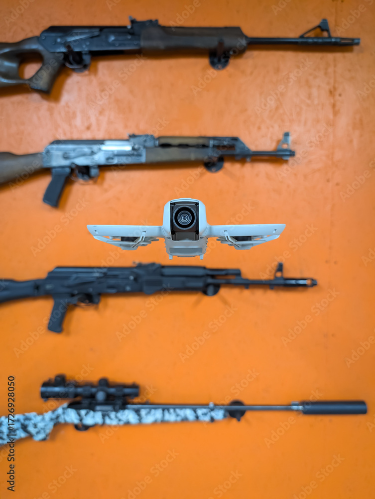 A modern reconnaissance drone representing surveillance and espionage, contrasted with an arsenal of military assault and sniper rifles on a wall.