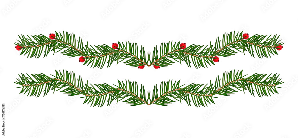 Christmas garlands with fir branches and red berries isolated on white background. Festive decoration element for holiday cards, invitations, banners, and design projects.