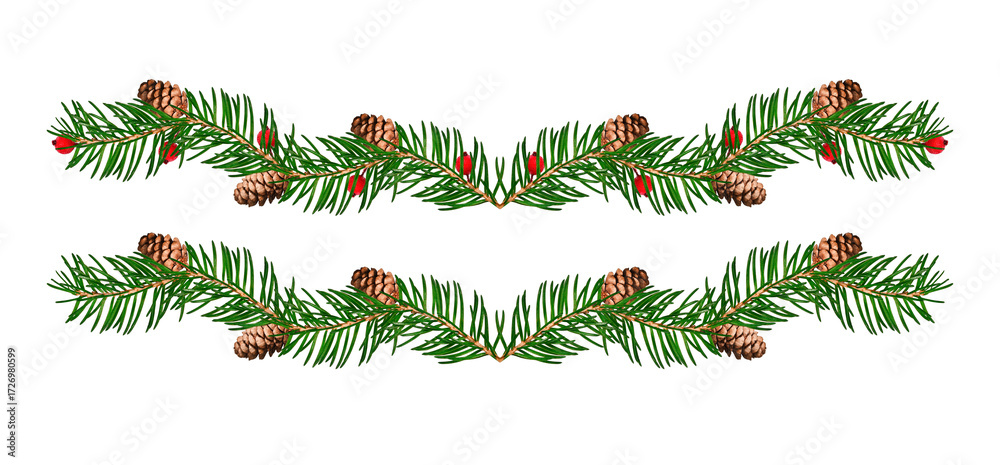 Winter garland of evergreen fir twigs, pinecones, and berries. Isolated Christmas decoration divider for seasonal greeting cards, invitations, posters, and digital designs.