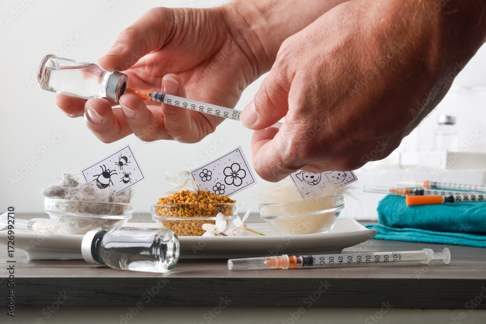 Detail of nurse preparing vaccine dose and typical allergens