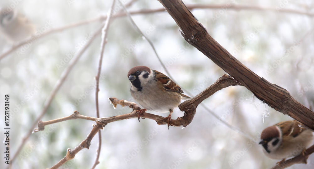 Sparrow on a frosty tree branch in winter with blurred natural background