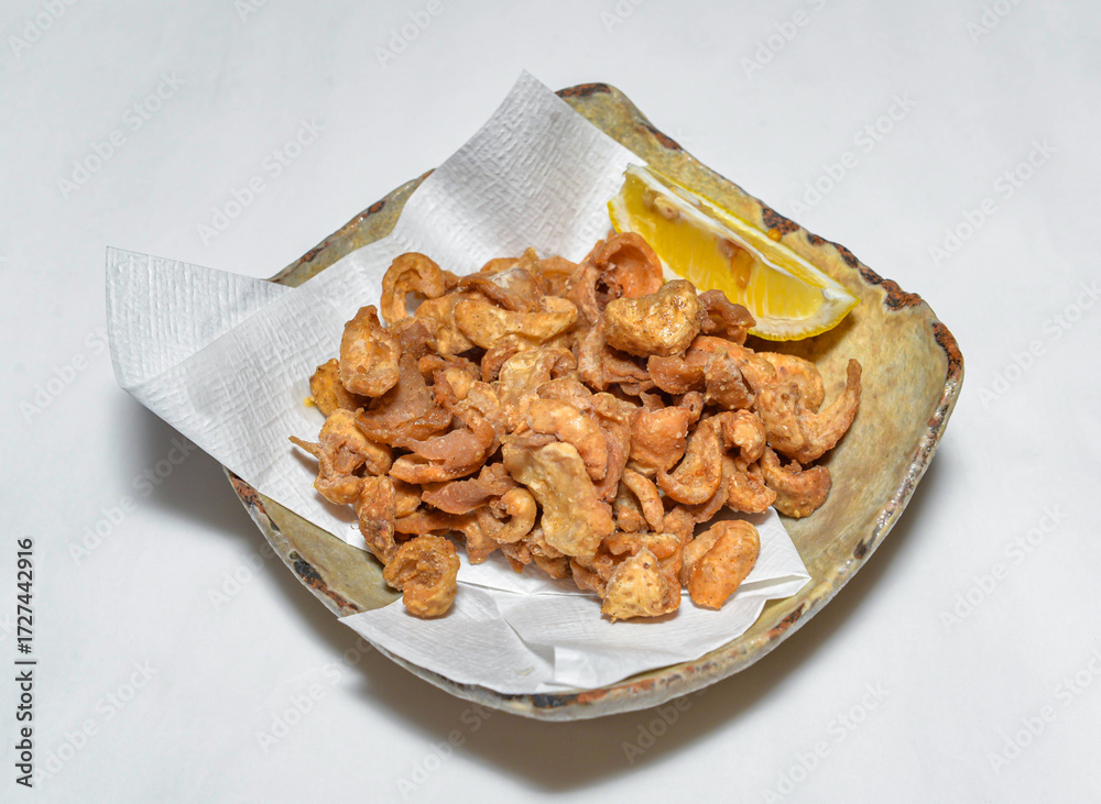 Crispy Fried Pork Rinds or Chicken Skin Crackers with Lemon in Plate side view of japanese food