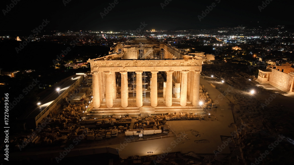 Aerial drone night shot of iconic illuminated world heritage site of Acropolis of Athens historic centre featuring the Parthenon, Propylaea and famous Porch of the Caryatids, Attica, Greece