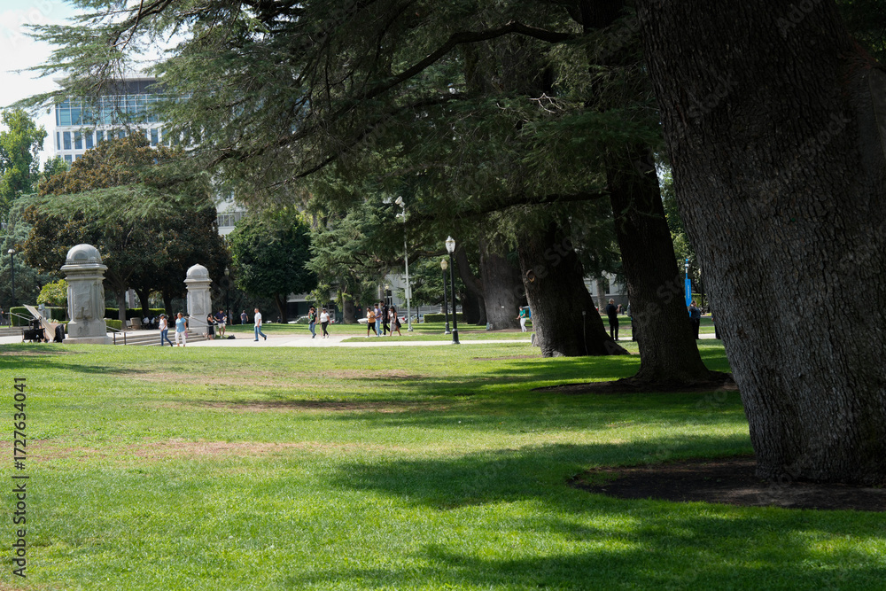 Tranquil park scene on California State Capital grounds featuring lush green lawns and tall trees casting long shadows, with stone pillars adding a historic touch.