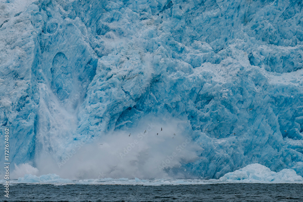Aialik Glacier face calving ice bergs into the bay with seabirds flying in front of the mountainous spray of the splash provides perspective on its size