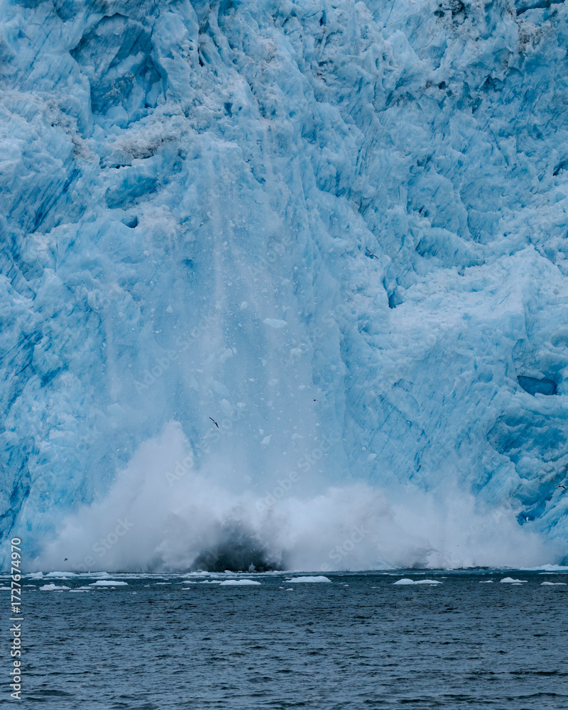 Aialik Glacier face calving ice bergs into the bay with seabirds flying in front of the mountainous spray of the splash provides perspective on its size