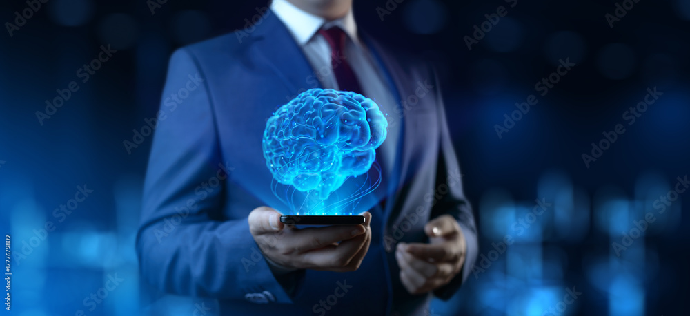 Businessman Holding Smartphone Phone with Human Brain Hologram - Futuristic Concept of Intelligence, science and mind