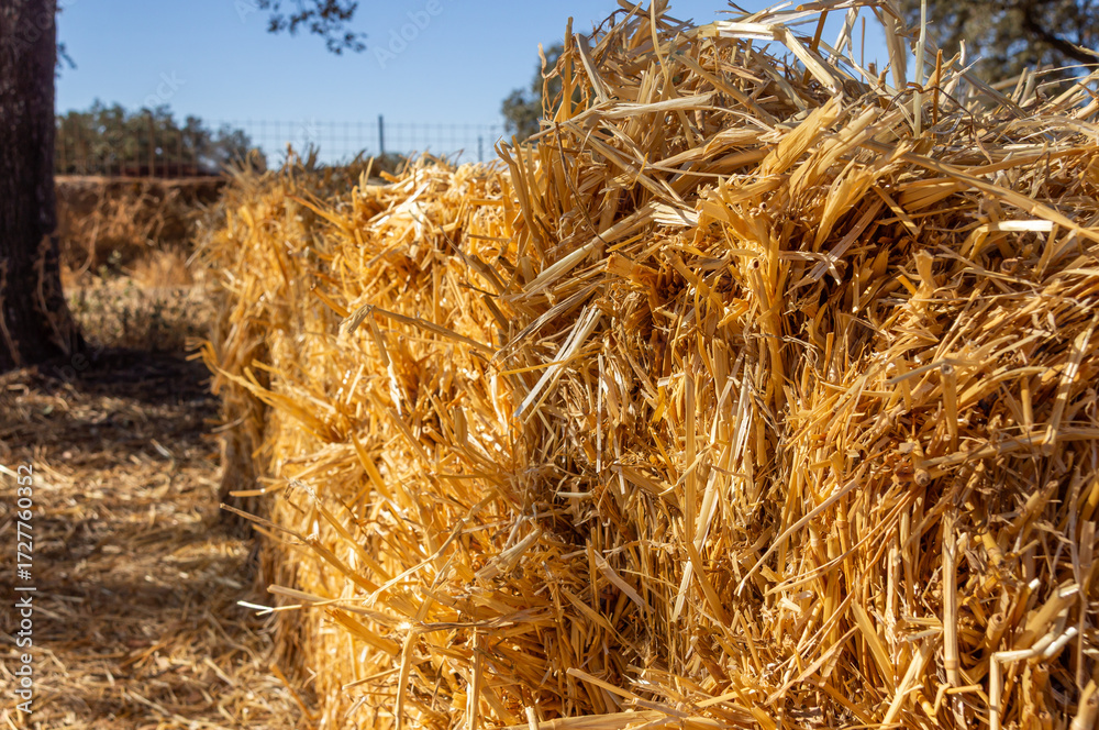 Golden Texture: Close-up of a Hay Bale's Surface.