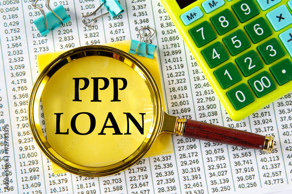 PPP LOAN - words on a white sheet with a calculator and a wooden house in the background