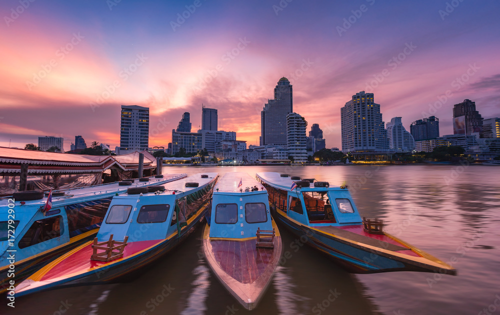 Long tail boat at chao phraya river in Bangkok city at dawn.