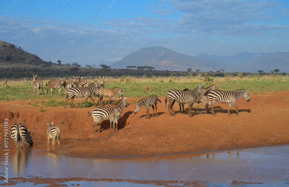 Plains zebras (Equus quagga) herd near a water hole. Tsavo East National Park, Kenya.